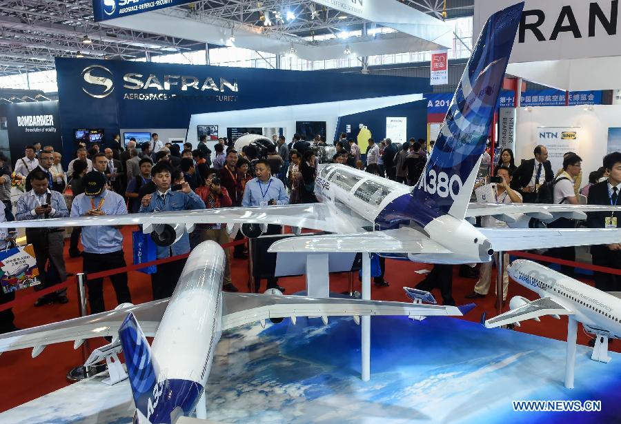 Visitors view the Airbus plane models at the 10th China International Aviation and Aerospace Exhibition in Zhuhai, south China's Guangdong Province, Nov. 11, 2014. Some 700 exhibitors at home and abroad with 130-plus planes attended the airshow from Nov. 11 to 16. (Xinhua/Liu Dawei)