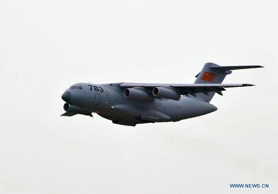 China's Y-20 military transport aircraft performs at the 10th China International Aviation and Aerospace Exhibition in Zhuhai, south China's Guangdong Province, Nov. 11, 2014. Some 700 exhibitors at home and abroad with 130-plus planes attended the airshow from Nov. 11 to 16. (Xinhua/Liang Xu)