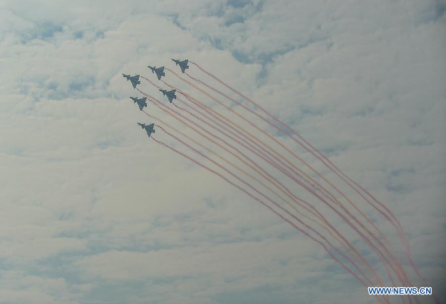 Jet fighters of the Bayi Aerobatic Team of the Air Force of the Chinese People's Liberation Army perform at the 10th China International Aviation and Aerospace Exhibition in Zhuhai, south China's Guangdong Province, Nov. 11, 2014. Some 700 exhibitors at home and abroad with 130-plus planes attended the airshow from Nov. 11 to 16. (Xinhua/Liu Dawei)