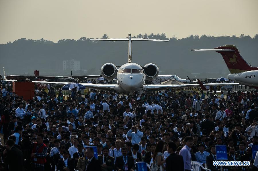 Visitors attend the opening ceremony of the 10th China International Aviation and Aerospace Exhibition in Zhuhai, south China's Guangdong Province, Nov. 11, 2014. Some 700 exhibitors at home and abroad with 130-plus planes attended the airshow from Nov. 11 to 16. (Xinhua/Liu Dawei)
