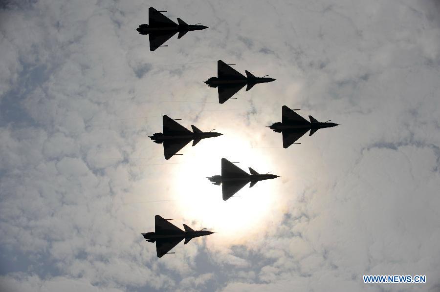 J-10 jet fighters of the Bayi Aerobatic Team of the Air Force of the Chinese People's Liberation Army perform at the 10th China International Aviation and Aerospace Exhibition in Zhuhai, south China's Guangdong Province, Nov. 11, 2014. Some 700 exhibitors at home and abroad with 130-plus planes attended the airshow from Nov. 11 to 16. (Xinhua/Liang Xu)