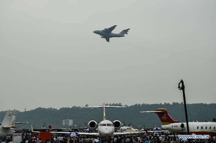 China's Y-20 military transport aircraft performs at the 10th China International Aviation and Aerospace Exhibition in Zhuhai, south China's Guangdong Province, Nov. 11, 2014. Some 700 exhibitors at home and abroad with 130-plus planes attended the airshow from Nov. 11 to 16. (Xinhua/Liu Dawei)