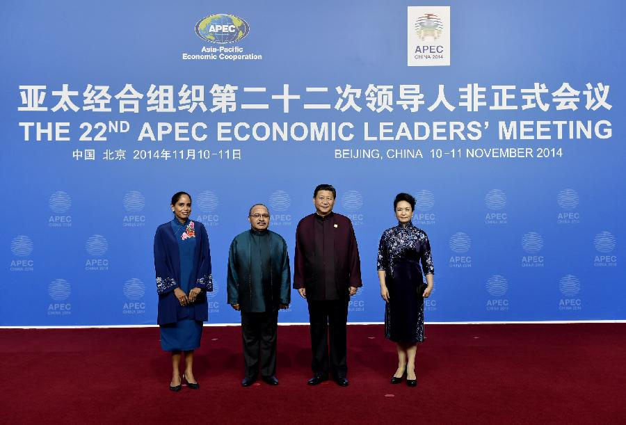 Chinese President Xi Jinping (2nd R) and his wife Peng Liyuan (R) pose for photo with Papua New Guinea's Prime Minister Peter O'Neill (2nd L) and his wife Lynda Babao before a welcome banquet for the 22nd Asia-Pacific Economic Cooperation (APEC) Economic Leaders' Meeting in Beijing, China, Nov. 10, 2014. (Xinhua/Xie Huanchi)