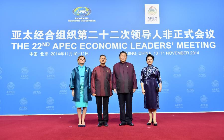 Chinese President Xi Jinping (2nd R), his wife Peng Liyuan (R), Mexican President Enrique Pena Nieto (2nd L) and his wife Angelica Rivera Hurtado pose for photo before a welcome banquet for the 22nd Asia-Pacific Economic Cooperation (APEC) Economic Leaders' Meeting in B?eijing, capital of China, Nov. 10, 2014. (Xinhua/Li Tao)
