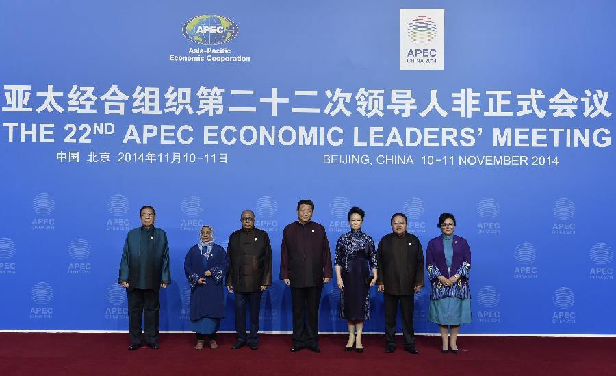 Chinese President Xi Jinping (C) and his wife Peng Liyuan (3rd R) pose for photos with Lao President Choummaly Sayasone (1st L), Bangladeshi President Abdul Hamid (3rd L), his wife Rashida (2nd L), Mongolian President Tsakhiagiin Elbegdorj (2nd R) and his wife Khajidsuren Bolormaa, who have been in China for a dialogue meeting on strengthening connectivity and improving cooperation, before a welcome banquet for the 22nd APEC Economic Leaders' Meeting in Beijing, capital of China, Nov. 10, 2014. (Xinhua/Xie Huanchi)