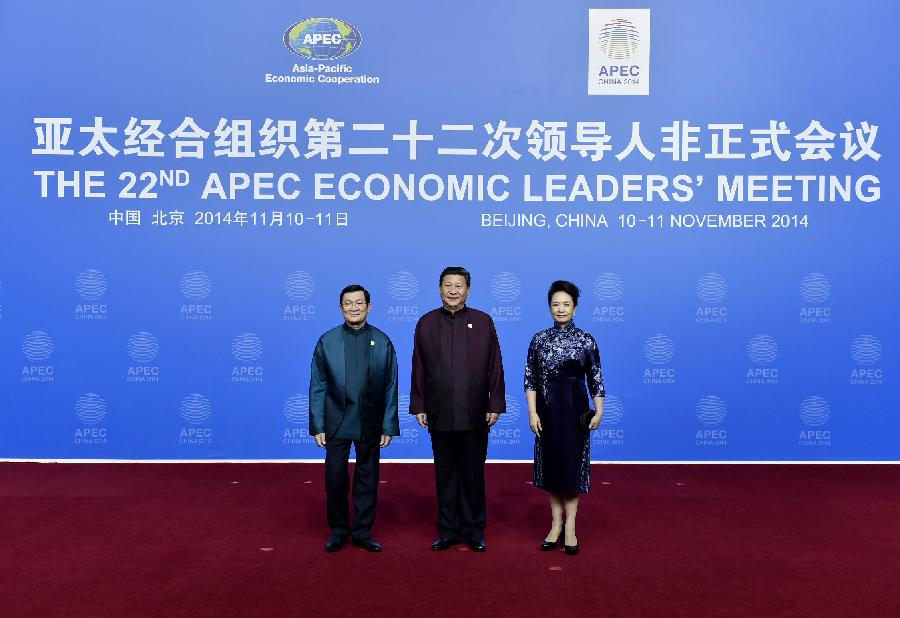 Chinese President Xi Jinping (C) and his wife Peng Liyuan (R) pose for photo with Vietnam's President Truong Tan Sang before a welcome banquet for the 22nd Asia-Pacific Economic Cooperation (APEC) Economic Leaders' Meeting in Beijing, China, Nov. 10, 2014. (Xinhua/Xie Huanchi)