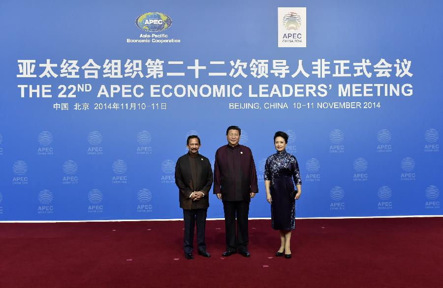 Chinese President Xi Jinping (C), his wife Peng Liyuan (R) and Brunei's Sultan Hassanal Bolkiah pose for a photo before a welcome banquet for the 22nd Asia-Pacific Economic Cooperation (APEC) Economic Leaders' Meeting in B?eijing, capital of China, Nov. 10, 2014. (Xinhua/Xie Huanchi)