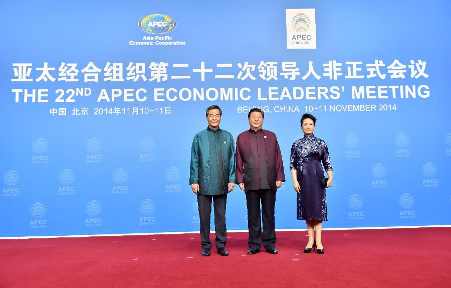Chinese President Xi Jinping (C), his wife Peng Liyuan (R) and Chief Executive of China's Hong Kong SAR Leung Chun-ying pose for a photo before a welcome banquet for the 22nd Asia-Pacific Economic Cooperation (APEC) Economic Leaders' Meeting in B?eijing, capital of China, Nov. 10, 2014. (Xinhua/Li Tao)