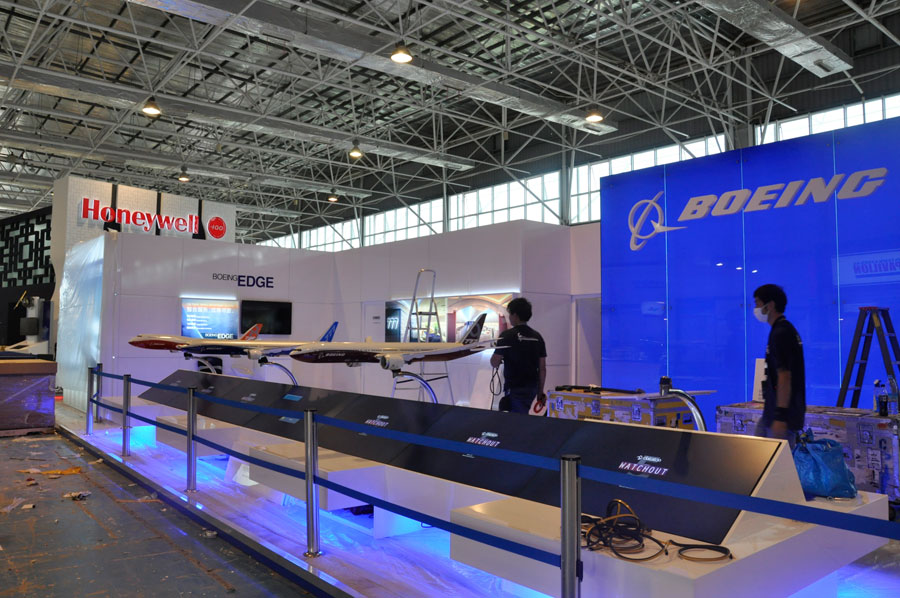 Photo taken on Nov. 10, 2014 shows exhibitors getting ready for the 10th China International Aviation & Aerospace Exhibition (Airshow China 2014) scheduled from Nov. 11 to 16 in Zhuhai, south China’s Guangdong province. (People’s Daily Online/ Sun Zhao)
