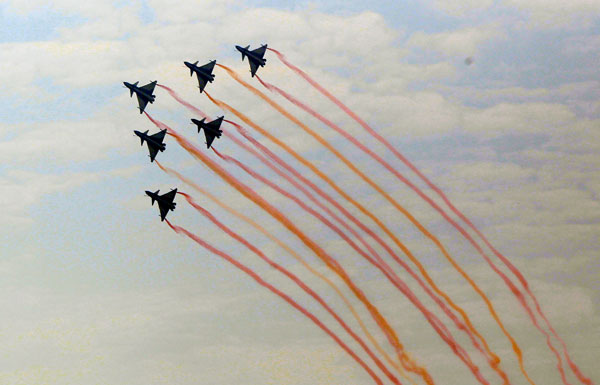 The PLA air force Bayi aerobatics team performs at the 10th China International Aviation and Aerospace Exhibition in Zhuhai, Guangdong province, on Tuesday. More than 700 companies from China and abroad are attending the show. [Photo by Zou Zhongpin/China Daily]