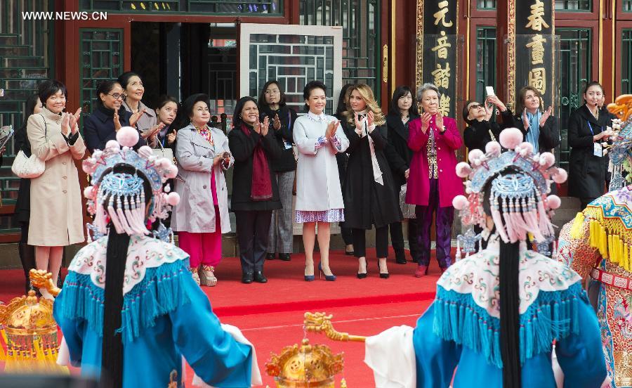 Peng Liyuan (C), wife of Chinese President Xi Jinping, and the wives of some leaders and representatives from the Asia-Pacific Economic Cooperation (APEC) member economies, watch Peking Opera during their visit to the Summer Palace in Beijing, China, Nov. 11, 2014. (Xinhua/Huang Jingwen)