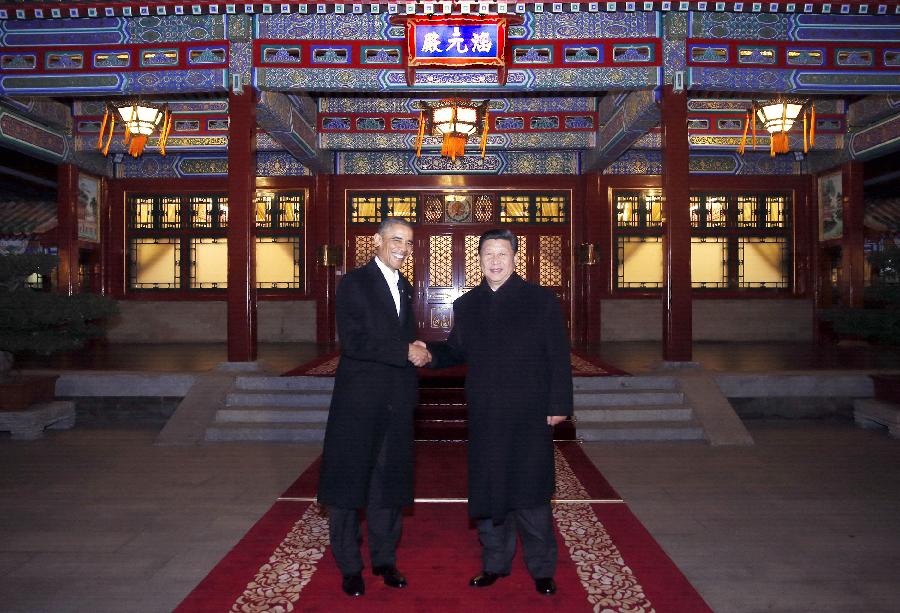 Chinese President Xi Jinping (R) and his U.S. counterpart Barack Obama shake hands at the Zhongnanhai leadership compound in Beijing, capital of China, Nov. 11, 2014. Xi Jinping held a bilateral meeting with visiting U.S. President Barack Obama in Beijing Tuesday evening. (Xinhua/Ju Peng)