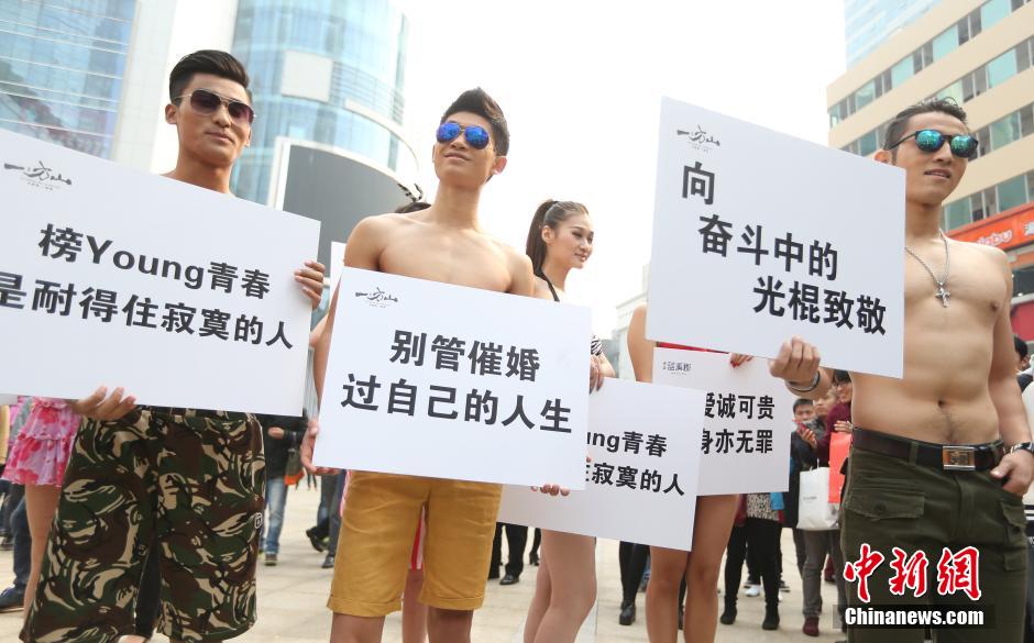 Placards reading "Although relationships are good, no one has the right to blame on singles", "Only you can decide your life" and "Pay tribute to singles" held by young people wearing summer clothes attract enormous attention in Nanjing, east China's Jiangsu province on Nov. 11, 2014. (CNS/Yang Bo)