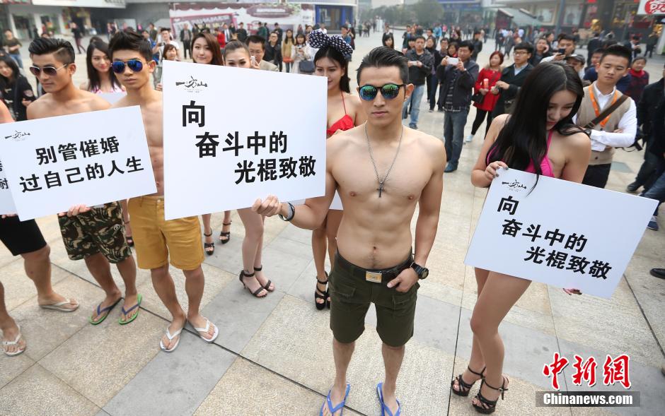 Placards reading "Although relationships are good, no one has the right to blame on singles", "Only you can decide your life" and "Pay tribute to singles" held by young people wearing summer clothes attract enormous attention in Nanjing, east China's Jiangsu province on Nov. 11, 2014. (CNS/Yang Bo)