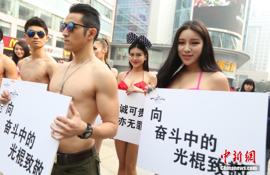 Placards reading "Although relationships are good, no one has the right to blame on singles", "Only you can decide your life" and "Pay tribute to singles" held by young people wearing summer clothes attract enormous attention in Nanjing, east China's Jiangsu province on Nov. 11, 2014. (CNS/Yang Bo)