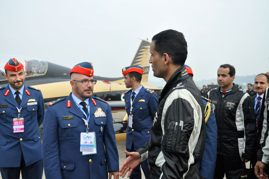 Photo taken on Nov. 11, 2014 shows Commander of the UAE Air Force & Air Defence Major General Staff Pilot Ibrahim Nasser M Al Alawi talks with the leader of the UAE National Aerobatic Team Nasser after its performance at the 10th China International Aviation & Aerospace Exhibition (Airshow China 2014) held from Nov. 11 to 16 in Zhuhai, south China’s Guangdong province. (People’s Daily Online/ Sun Zhao)