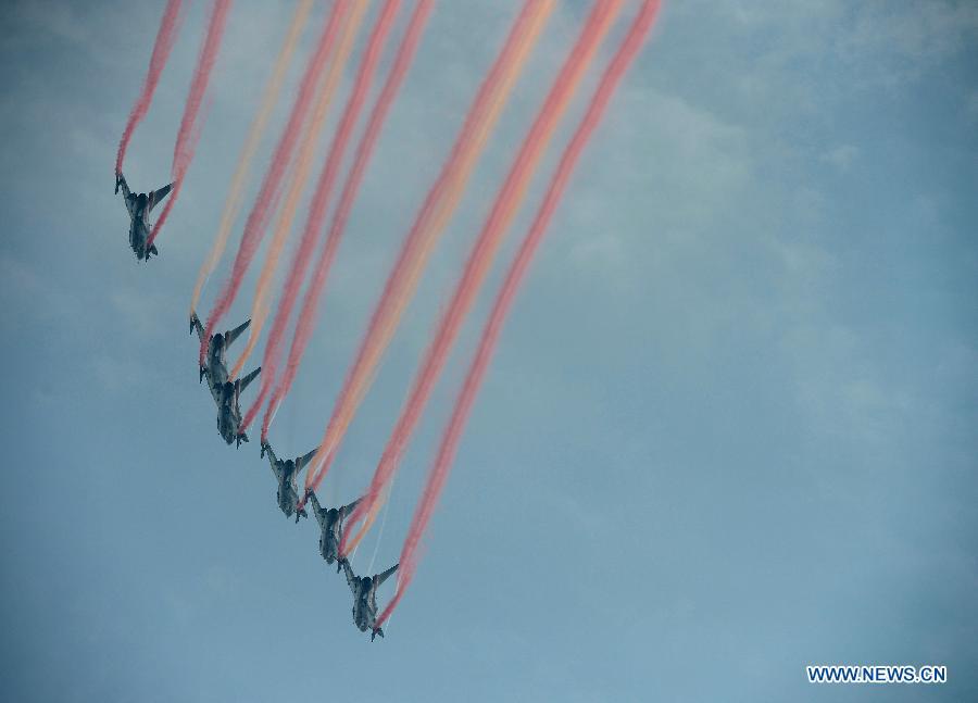 J-10 jet fighters of the Bayi Aerobatic Team of the Air Force of the Chinese People's Liberation Army perform at the 10th China International Aviation and Aerospace Exhibition in Zhuhai, south China's Guangdong province, Nov 11, 2014. This Tuesday marks the 65th anniversary of the establishment of the Air Force of the Chinese People's Liberation Army (PLA). (Xinhua/Shen Ling)