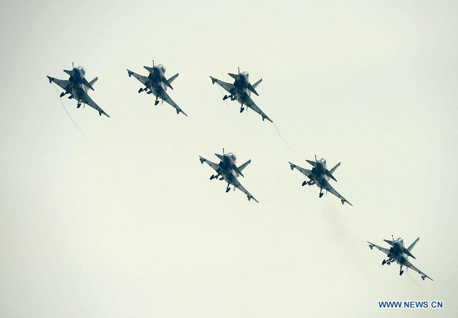 J-10 jet fighters of the Bayi Aerobatic Team of the Air Force of the Chinese People's Liberation Army perform at the 10th China International Aviation and Aerospace Exhibition in Zhuhai, south China's Guangdong province, Nov 11, 2014. This Tuesday marks the 65th anniversary of the establishment of the Air Force of the Chinese People's Liberation Army (PLA). (Xinhua/Shen Ling)