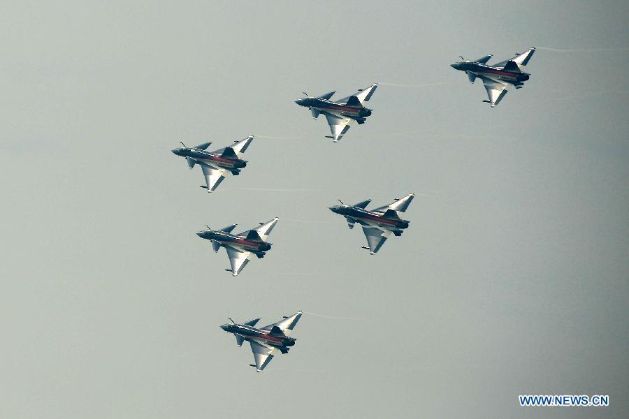 J-10 jet fighters of the Bayi Aerobatic Team of the Air Force of the Chinese People's Liberation Army perform at the 10th China International Aviation and Aerospace Exhibition in Zhuhai, south China's Guangdong province, Nov 11, 2014. This Tuesday marks the 65th anniversary of the establishment of the Air Force of the Chinese People's Liberation Army (PLA). (Xinhua/Shen Ling)