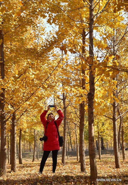 A visitor takes photos at a ginkgo forest in Ji'nan, capital of east China's Shandong Province, Nov. 13, 2014. (Xinhua/Xu Suhui)