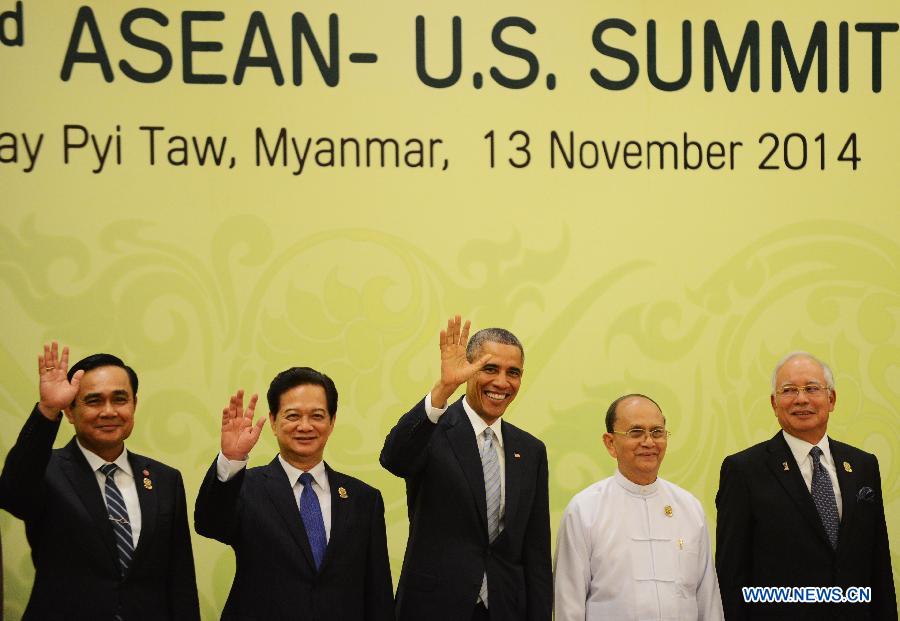 Thai Prime Minister Prayut Chan-o-cha, Vietnamese Prime Minister Nguyen Tan Dung, U.S. President Barack Obama, Myanmar President U Thein Sein and Malaysian Prime Minister Najib Razak (L to R) greet reporters during a photo session ahead of the 2nd ASEAN-U.S. Summit in Nay Pyi Taw, Myanmar, on Nov. 13, 2014. The 2nd ASEAN-U.S. Summit was held here on Thursday. (Xinhua/Liu Yun)