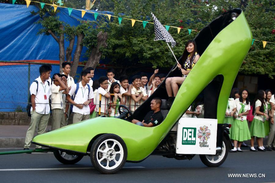 A giant shoe car cruises during the "Tour de Takong" (Tour of High Heels) in Marikina City, the Philippines, on Nov. 13, 2014. Residents took part in the annual Tour of High Heels or stiletto race in celebration of the Shoe Festival in Marikina City, which is also known as the "shoe capital" of the Philippines. (Xinhua/Rouelle Umali)