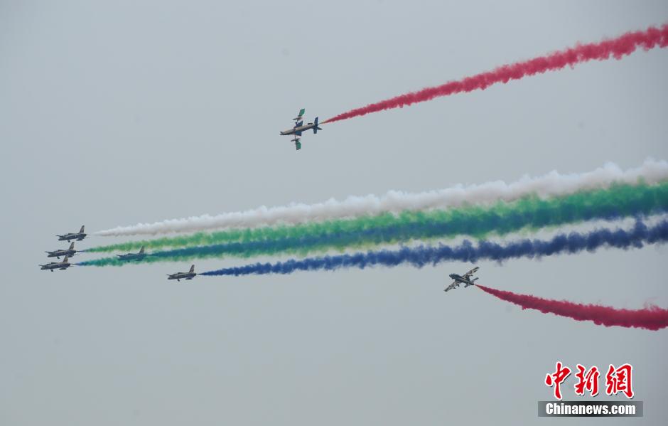 On Nov. 12, 2014, the Bayi Aerobatics Team of the Chinese Air Force, the Russian Knights Aerobatics Team and the United Arab Emirates’ National Aerobatic Team give splendid performances for guests from both home and abroad at the Airshow China 2014 in Zhuhai. (Chinanews/Chen Wen)