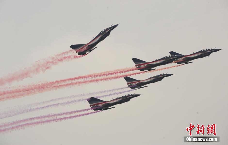 On Nov. 12, 2014, the Bayi Aerobatics Team of the Chinese Air Force, the Russian Knights Aerobatics Team and the United Arab Emirates’ National Aerobatic Team give splendid performances for guests from both home and abroad at the Airshow China 2014 in Zhuhai. (Chinanews/Chen Wen)