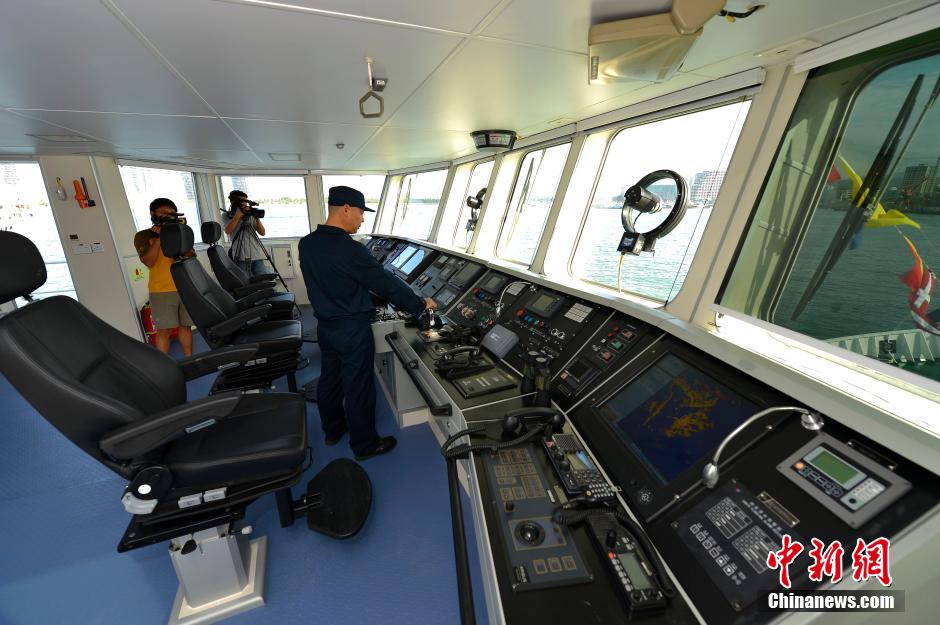 On Nov. 6, 2014, Haixun 1103, the first large patrol ship of the Sanya Maritime Safety Administration, was officially commissioned. The ship is 64 meters long, 10 meters wide, with 830 tons of displacement and 1,800 sea miles of cruising ability. The well-equipped ship is capable of conducting air and sea cruise under various weather conditions. (Chinanews/Luo Yunfei)