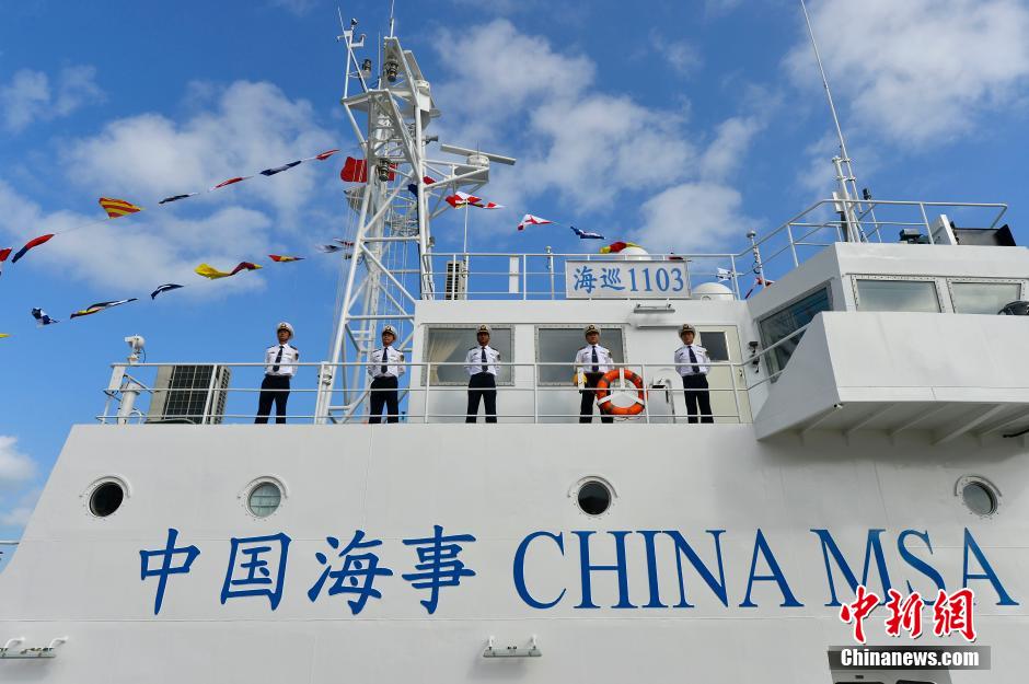 On Nov. 6, 2014, Haixun 1103, the first large patrol ship of the Sanya Maritime Safety Administration, was officially commissioned. The ship is 64 meters long, 10 meters wide, with 830 tons of displacement and 1,800 sea miles of cruising ability. The well-equipped ship is capable of conducting air and sea cruise under various weather conditions. (Chinanews/Luo Yunfei)