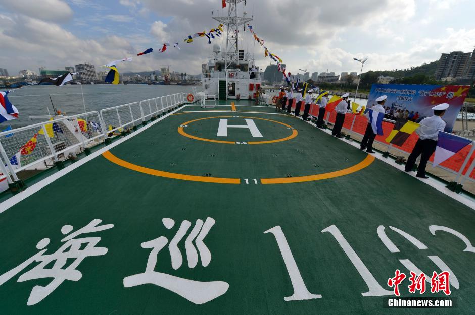 On Nov. 6, 2014, Haixun 1103, the first large patrol ship of the Sanya Maritime Safety Administration, was officially commissioned. The ship is 64 meters long, 10 meters wide, with 830 tons of displacement and 1,800 sea miles of cruising ability. The well-equipped ship is capable of conducting air and sea cruise under various weather conditions. (Chinanews/Luo Yunfei)