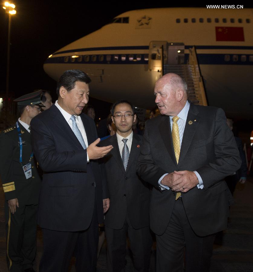 Chinese President Xi Jinping (L, front) is welcomed by Australian Governor-General Peter Cosgrove (R, front) upon his arrival in Brisbane, Australia, Nov. 14, 2014. Xi arrived here Friday to attend the 9th G20 Summit slated for Nov. 15-16 and pay a state visit to Australia after that. (Xinhua/Li Xueren)