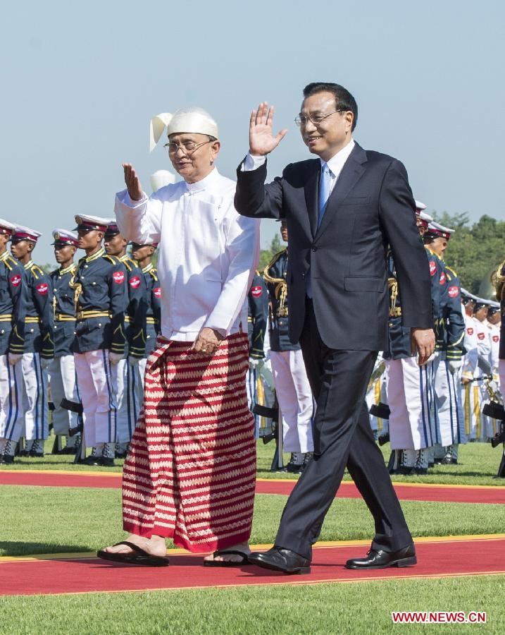 Chinese Premier Li Keqiang (R) attends a welcome ceremony held by Myanmar President U Thein Sein prior to their talks in Nay Pyi Taw, Myanmar, Nov. 14, 2014. (Xinhua/Wang Ye)