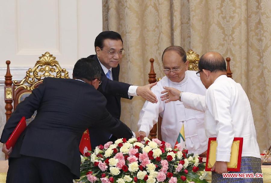 Chinese Premier Li Keqiang (L rear) and Myanmar President U Thein Sein jointly attend a signing ceremony of documents on bilateral cooperation in the realms of business, agriculture, finance and energy sources in Nay Pyi Taw, Myanmar, Nov. 14, 2014. (Xinhua/Ju Peng)