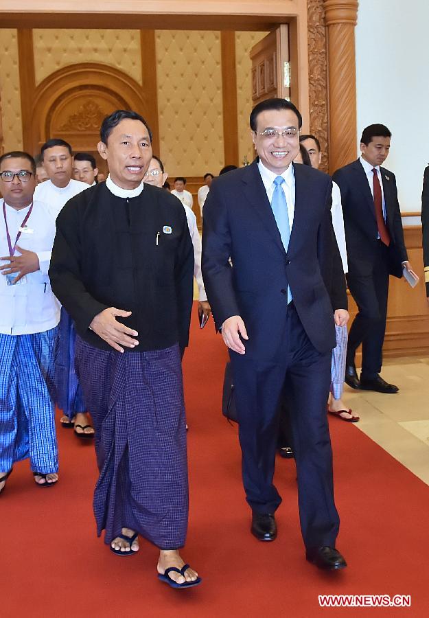 Chinese Premier Li Keqiang (R front) meets with Thura U Shwe Mann, speaker of Myanmar's Union Parliament and the House of Representatives, in Nay Pyi Taw, Myanmar, Nov. 14, 2014. (Xinhua/Li Tao)
