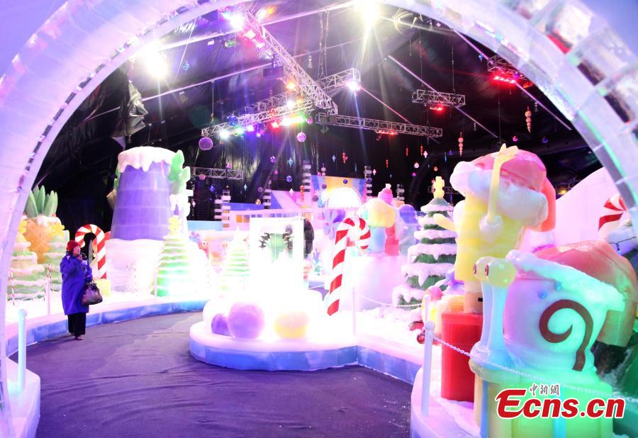 Ice sculptures resembling Bikini Bottom, the underwater home for SpongeBob and his friends, are seen at an ice sculpture show in the Moody Garden of Texas, US on November 14, 2014. A skilled team of 31 internationally-acclaimed professional ice carvers from China’s Harbin dove into 900 tons of ice and transformed them into majestic marvels featuring holiday scenes with the beloved Bikini Bottom inhabitants from Nickelodeon’s SpongeBob SquarePants. The event kicked off on November 15, and would last until next January. [Photo: China News Service/ Wang Huan]