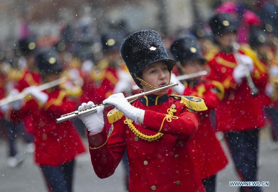 A band performs during the 110th Annual Toronto Santa Claus Parade in Toronto, Canada, Nov. 16, 2014. With 21 bands, 31 floats and more than 3,000 volunteers, the Parade kicked off at Toronto on Sunday. (Xinhua/Zou Zheng)