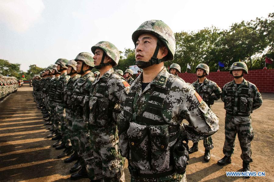 Chinese soldiers stand at attention at the starting ceremony of the Hand-in-hand India-China Anti-Terrorism Joint Training Exercise in Pune, India, Nov. 17, 2014. The joint counterterrorism training exercise would last for ten days. (Xinhua/Zheng Huansong)