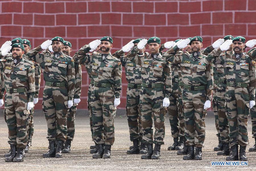 Indian soldiers salute at the starting ceremony of the Hand-in-hand India-China Anti-Terrorism Joint Training Exercise in Pune, India, Nov. 17, 2014. The joint counterterrorism training exercise will last for ten days. (Xinhua/Zheng Huansong)