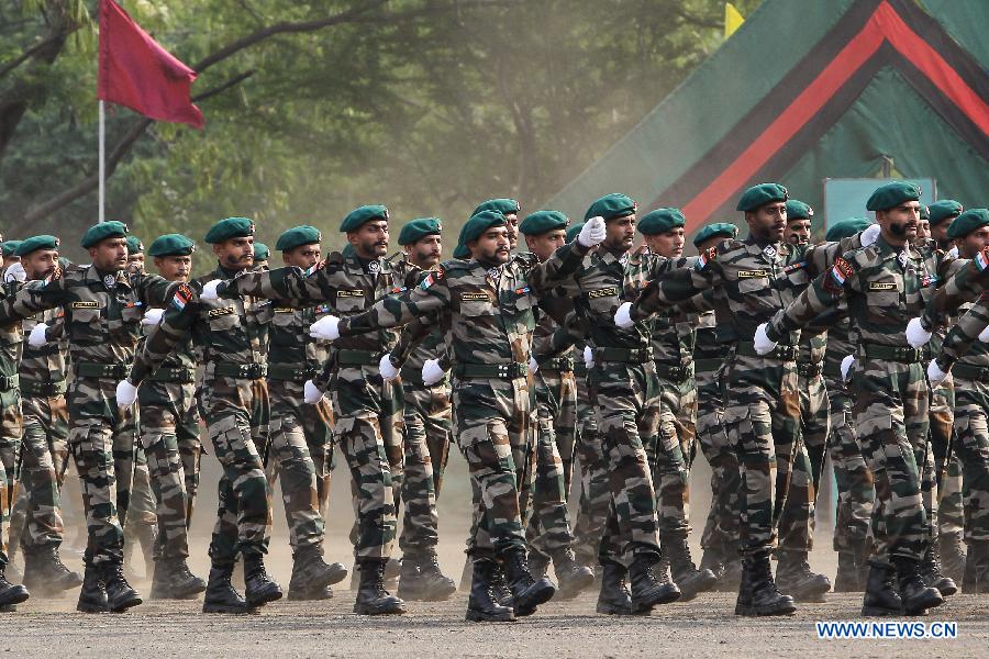 Indian soldiers march at the starting ceremony of the Hand-in-hand India-China Anti-Terrorism Joint Training Exercise in Pune, India, on Nov. 17, 2014. The joint counterterrorism training exercise will last for ten days. (Xinhua/Zheng Huansong)
