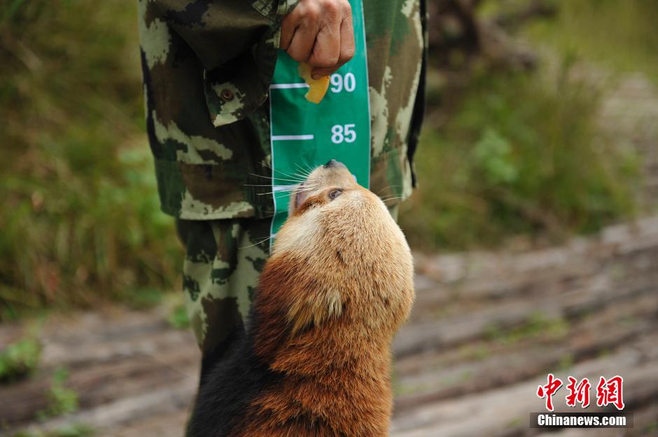 Staff members measure a little panda's height. (CNS/Liu Ranyang)