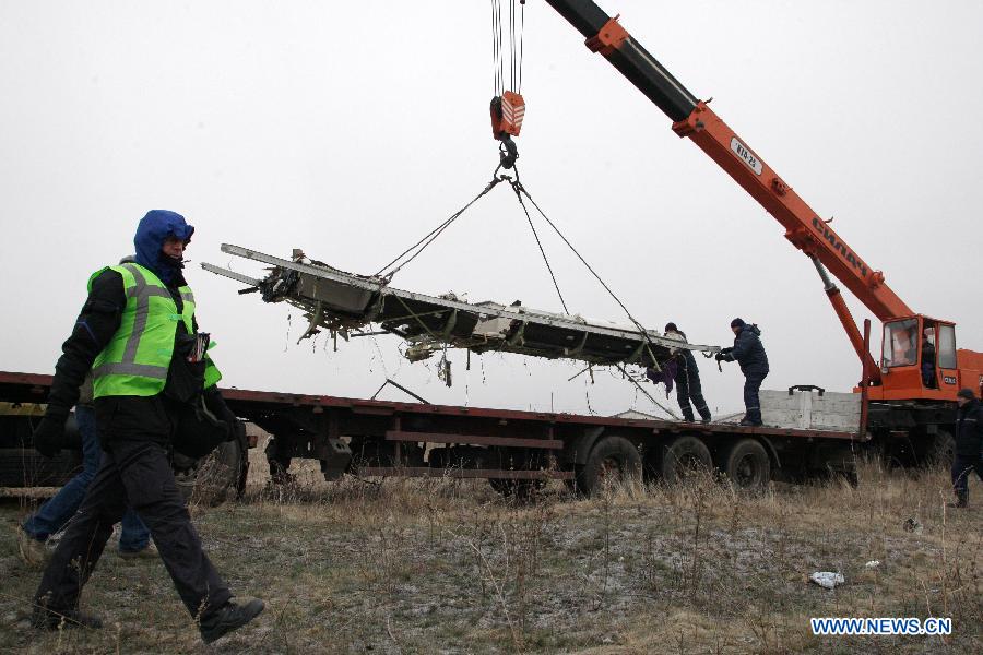 | Workers work on the site where the MH17 plane of Malaysia Airlines crashed, on the outskirts of Donetsk, eastern Ukraine, on Nov. 18, 2014. The recovery of the wreckage of flight MH17 will be completed in around five days, the Dutch Safety Board, leading the investigation into the crash in eastern Ukraine, announced on Monday. (Xinhua/Alexander Ermochenko) |