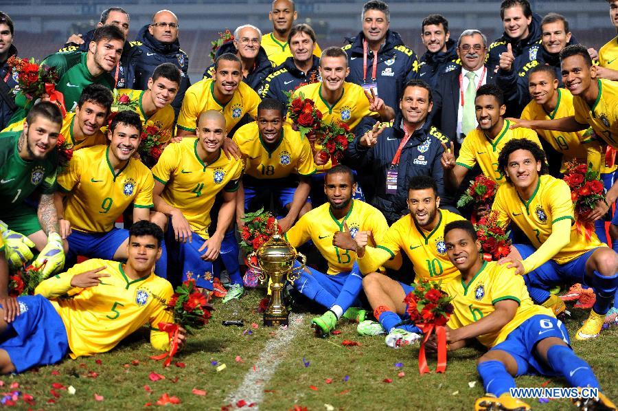 U-22 players of Brazil celebrate with trophy after the International Youth Football Tournament match against China U-22 Team in Wuhan, central China's Hubei Province, Nov. 18, 2014. Brazil defeated China with 2-1 and claimed the title after 2 wins and 1 draw.(Xinhua/Xiao Yijiu)