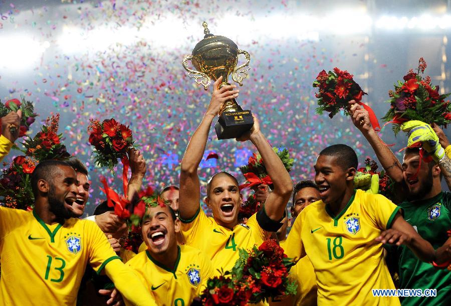 | U-22 players of Brazil celebrate with trophy after the International Youth Football Tournament match against China U-22 Team in Wuhan, central China's Hubei Province, Nov. 18, 2014. Brazil defeated China with 2-1 and claimed the title after 2 wins and 1 draw.(Xinhua/Xiao Yijiu) |