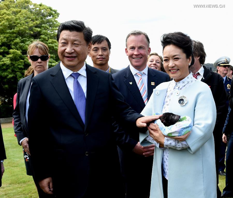 | Chinese President Xi Jinping and his wife Peng Liyuan pet a Tasmanian devil after planting a tree with students of a primary school in Tasmania state, Australia, Nov. 18, 2014. (Xinhua/Rao Aimin) |