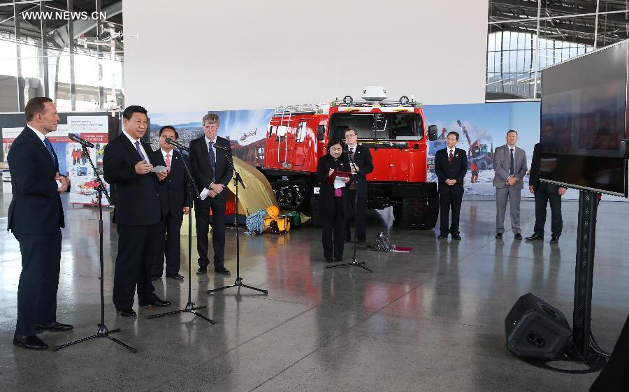 Chinese President Xi Jinping (2nd L) and Australian Prime Minister Tony Abbott (1st L) speak via live video with scientists of both countries stationed at the South Pole, respectively from Australia's Davis Station and China's Zhongshan Station, in Hobart, Australia, Nov. 18, 2014. (Xinhua/Yao Dawei)