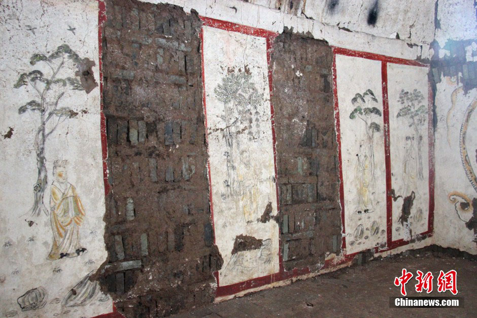 According to news released by Shaanxi Provincial Institute of Archeology on Nov. 18, 2014, the excavation of the joint tomb of Chancellor Han Xiu and his wife of Tang Dynasty (618-907) has finished. Hundreds of cultural relics were excavated, including epitaph, tomb figures and exquisite frescoes that are still colorful after over 1,000 years. The landscape painting on the north wall of the coffin chamber is the earliest Tang fresco on a single wall discovered so far. (Chinanews/Zhang Yuan)