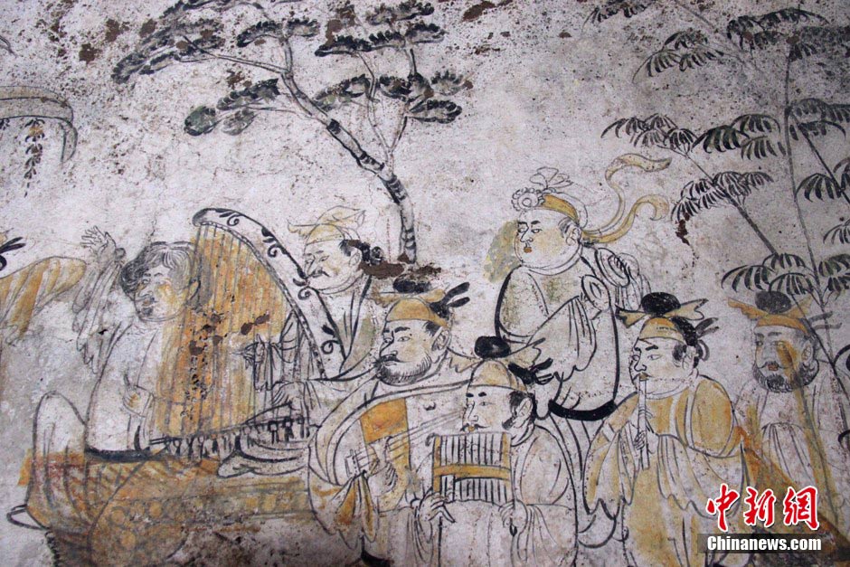 According to news released by Shaanxi Provincial Institute of Archeology on Nov. 18, 2014, the excavation of the joint tomb of Chancellor Han Xiu and his wife of Tang Dynasty (618-907) has finished. Hundreds of cultural relics were excavated, including epitaph, tomb figures and exquisite frescoes that are still colorful after over 1,000 years. The landscape painting on the north wall of the coffin chamber is the earliest Tang fresco on a single wall discovered so far. (Chinanews/Zhang Yuan)