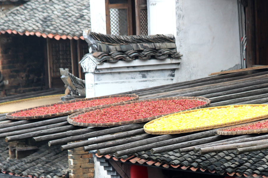 Photos show chilies and chrysanthemum flowers being dried on the roofs of houses in Wuyuan county, east China's Jiangxi province on Nov. 16, 2014. More than 40 reporters from foreign-language media in China will visit Jiangxi province until Nov. 20, 2014. (Photo/People’s Daily Online)