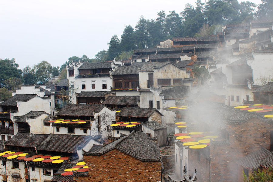 Photos show chilies and chrysanthemum flowers being dried on the roofs of houses in Wuyuan county, east China's Jiangxi province on Nov. 16, 2014. More than 40 reporters from foreign-language media in China will visit Jiangxi province until Nov. 20, 2014. (Photo/People’s Daily Online)